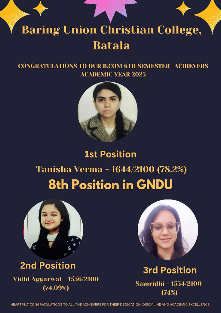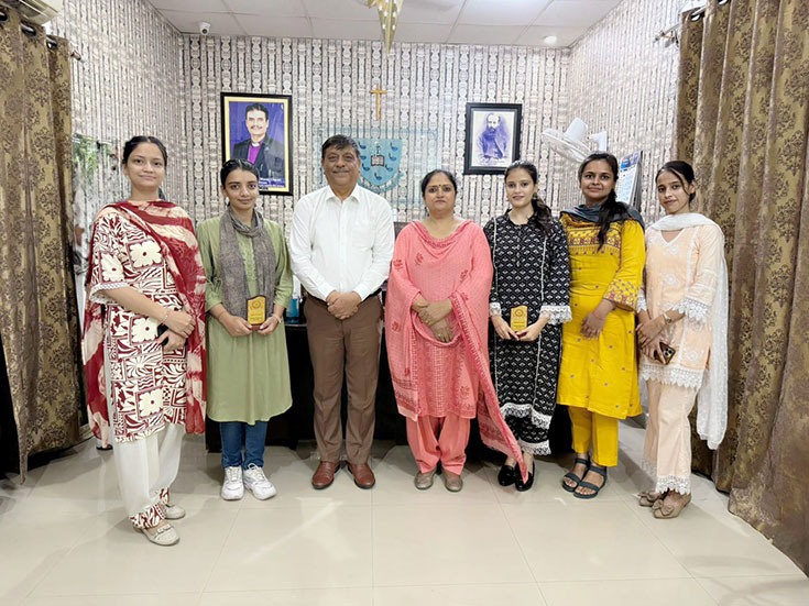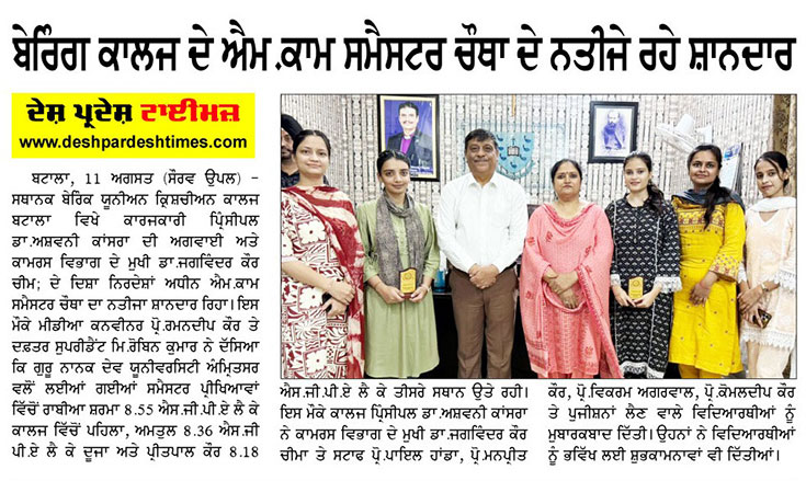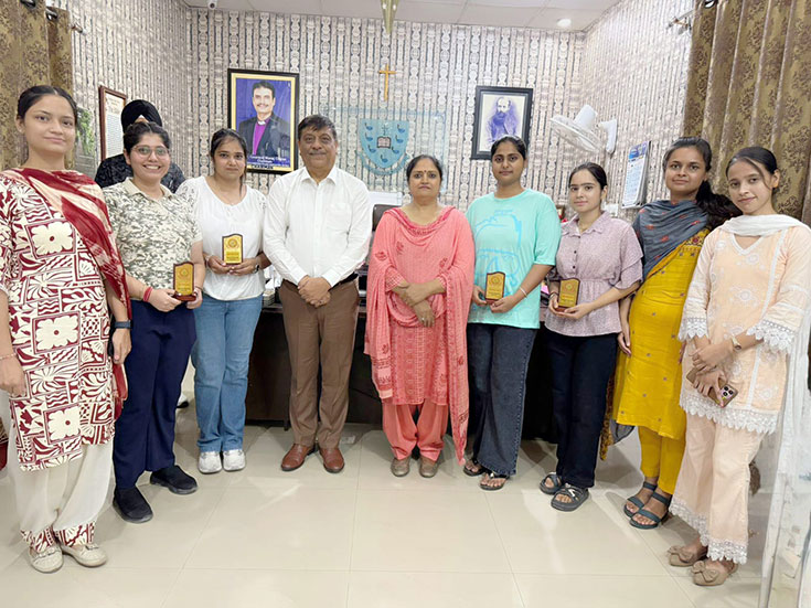 Principal Prof.(Dr.) Edward Masih, HoD Computer science and IT, Mr Narinder Singh, Prof.Harprabdeep Singh, Prof. Ashwani Kumar and Prof. Alka Bamotra while Congratulating University Merit holder(3rd Position)Jasmeen Kaur of